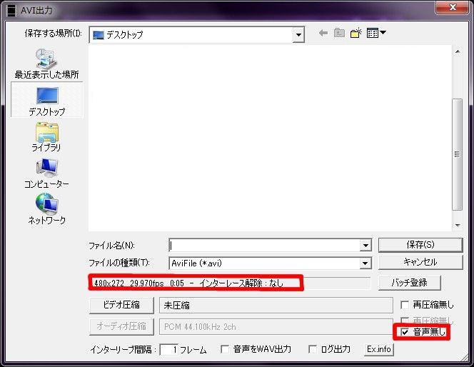 ⑦ 「AVI出力」で↓のように設定して音なしAVIを保存。