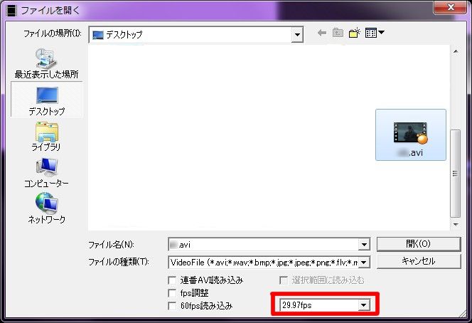 赤枠の部分を「29.97fps」に設定し、さっき変換した動画を選択。